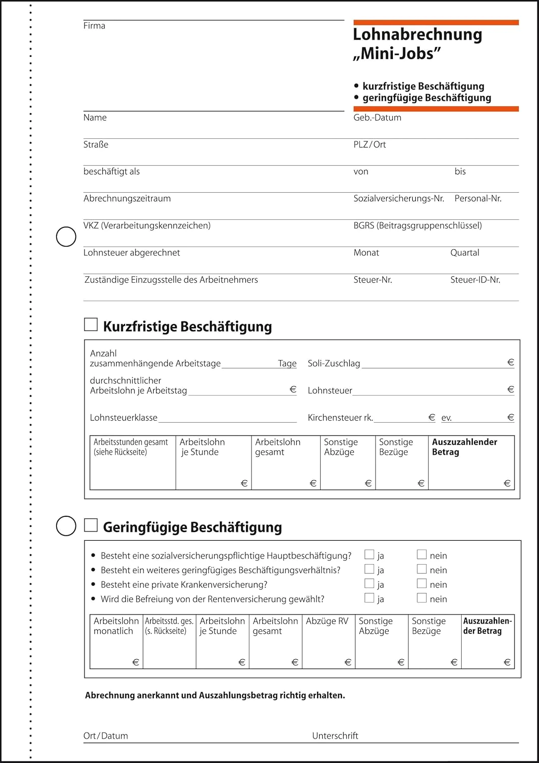 Formularblock Lohnabrechnung für Mini-Jobs A5 50 Blatt Sigel holzfreies Papier