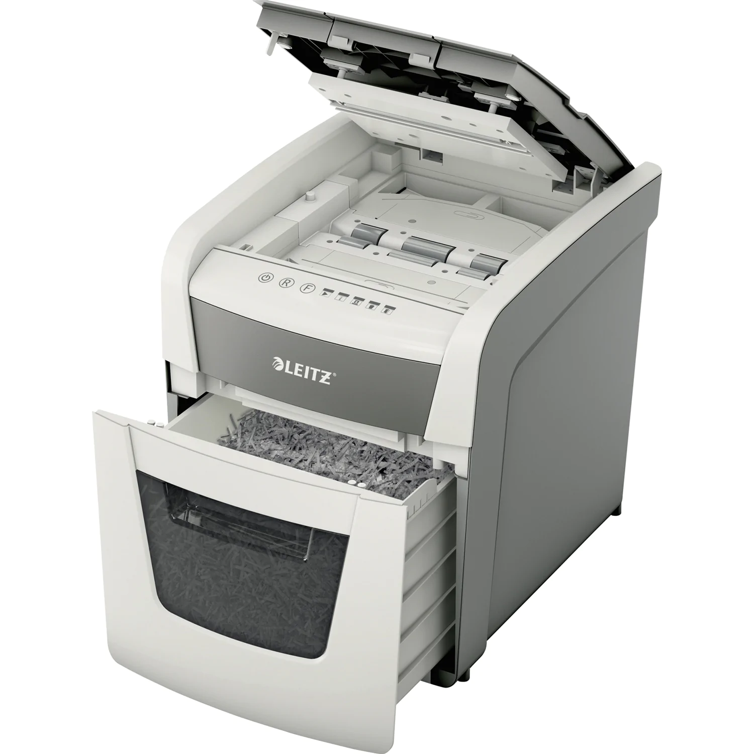 Leitz Aktenvernichter IQ Autofeed Small Office 50. Elektrischer, vollautomatischer Aktenvernichter für Home Office oder kleine Büros mit 1-5 Benutzern. Der zu vernichtende Papierstapel wird einfach in das Gerät eingelegt und das Gerät arbeitet selbstständig. Mit einzigartiger Funktion für eine saubere Entleerung des Abfallbehälters: Die Schneidewellen laufen nach jedem Vorgang kurz rückwärts um zu verhindern, dass beim Herausziehen Papierschnipsel hinter den Abfallbehälter fallen. Automatische Papierzuführung. Mit Touch Control und Anti-Papierstau-Technologie. Mit Autoreverse und Auto Start/Stop. Mit Infrarot-Sensoranzeige für vollen Abfallbehälter. Sehr leiser Betrieb. Mit Laufrollen für mehr Mobilität. Einfach zu leerender, herausziehbarer Abfallbehälter.